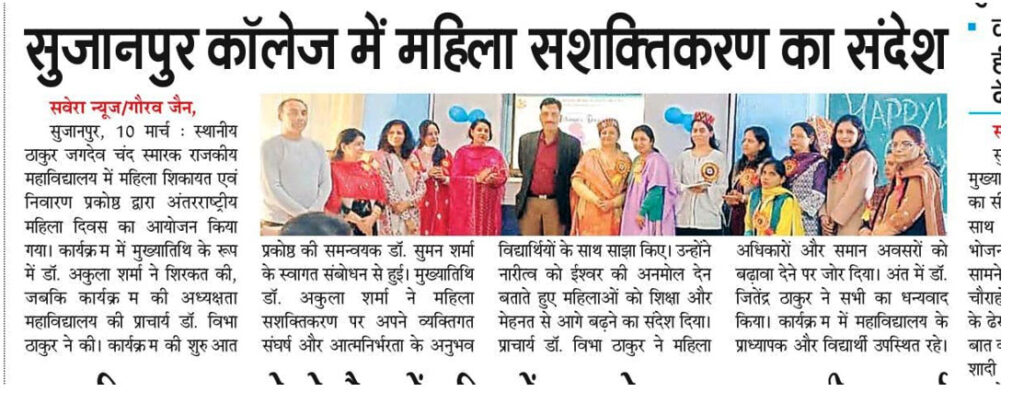- Women grievance redressal cell is a growing community of women in Thakur Jagdev Chand Memorial Govt. Degree College, Sujanpur Tira which share a common purpose to learn, educate and collaborate on ideas that have the power to effect meaningful and positive change while fighting the challenges they face.
